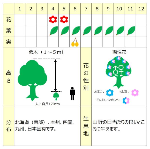 小さな赤い花と真っ赤な実がなる小さな木です。 実は甘く食べられます。 この実のなる頃、 「うぐいす」などの小さい鳥が、 この木の茂みの中を舞い飛ぶことから「ウグイスカグラ」となったという説があります。