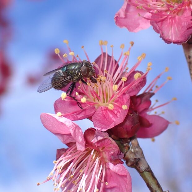 花にはミツバチ、 ハナアブ、 ハエの仲間などの昆虫の他に、 メジロやヒヨドリがよく来ます。 梅干しを食べられるのは、 これらの虫や鳥のお陰です。