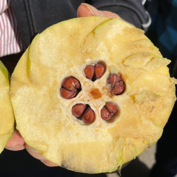 秋には黄色くて大きな実がゴロゴロ実ります。 実は生では食べられませんが果実酒や砂糖漬けなどにして食べられます。