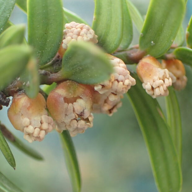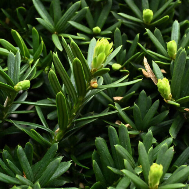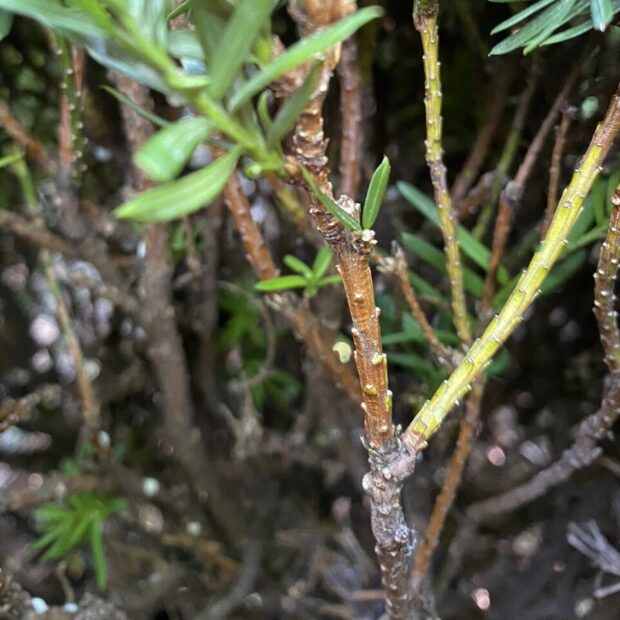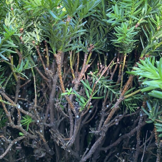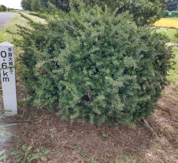 日本海側や山の尾根などが故郷です。 キャラボク(イチイの仲間)は針葉樹ではめずらしく葉に樹脂道がなく、 べたべたしないので枝を整えやすいです。 庭木として植えられたキャラボクは刈り込まれて、 野生の面影はないですが、 本来は風が強い尾根などで地面をはうように伸び、 過酷な環境で耐える力を持っています。