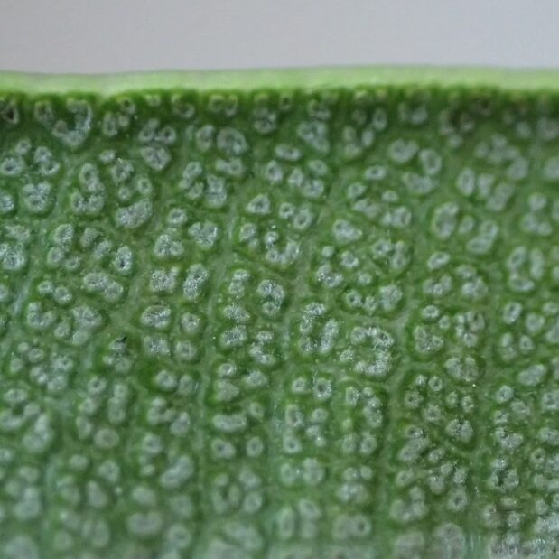 • 裏に気孔を守る白い毛の生えた小さな穴がある