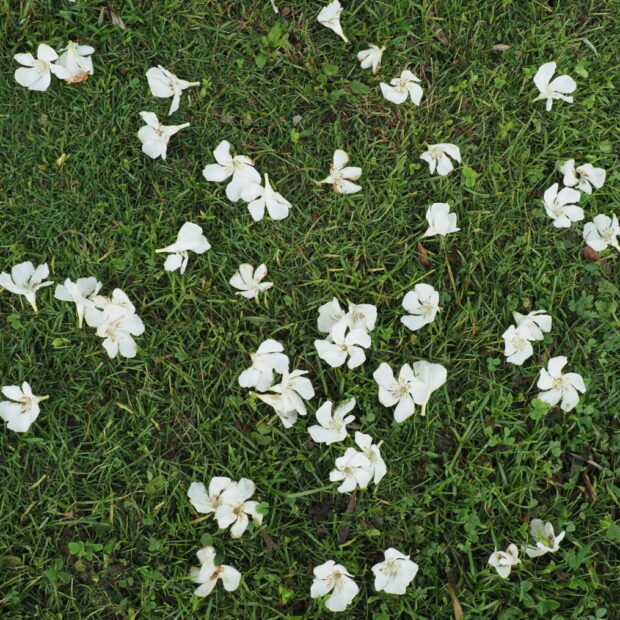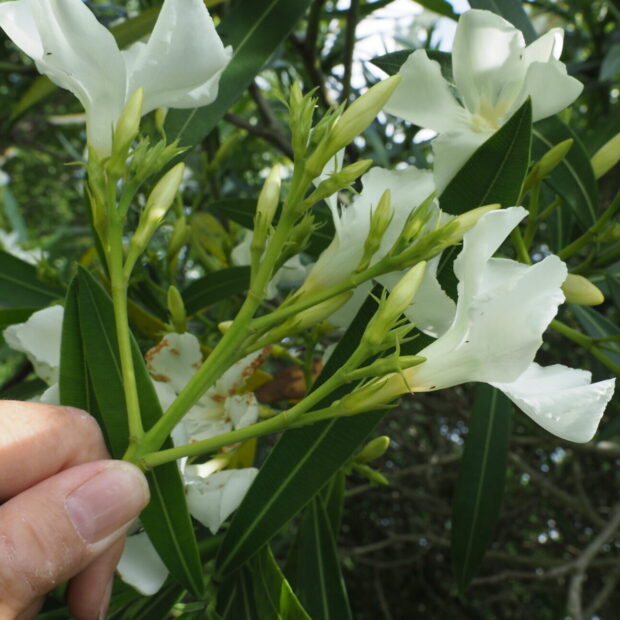 インド原産で、 竹やモモに似ていると言われ、 花の少ない夏に咲き誇り、 ガツガツ下から枝葉を出します。 全部切っても不死鳥のごとく枝葉を出します。 有毒植物で、 葉を食べた動物は死んでしまいます。 南ではきっと激しい生存競争があるのでしょう。 強くなくては生き残れません。