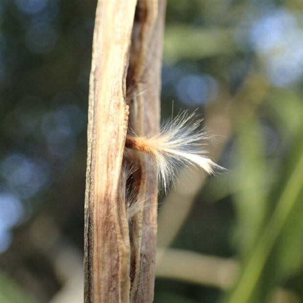 綿毛のついた面白い種が細長いさやから出てきますよ。