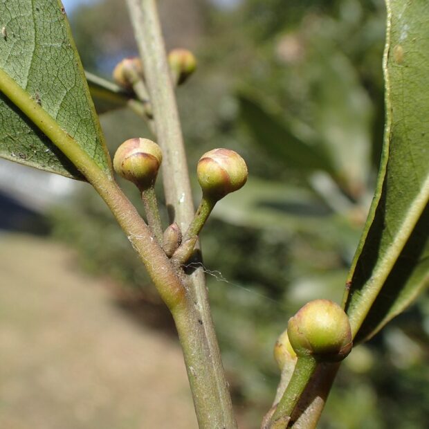 枝や葉にルビーロウムシというカイガラムシがつくことがあります。 カイガラムシがびっしりつくと、 排泄物にカビがつき、 すす病を引き起こし葉が黒くなります。