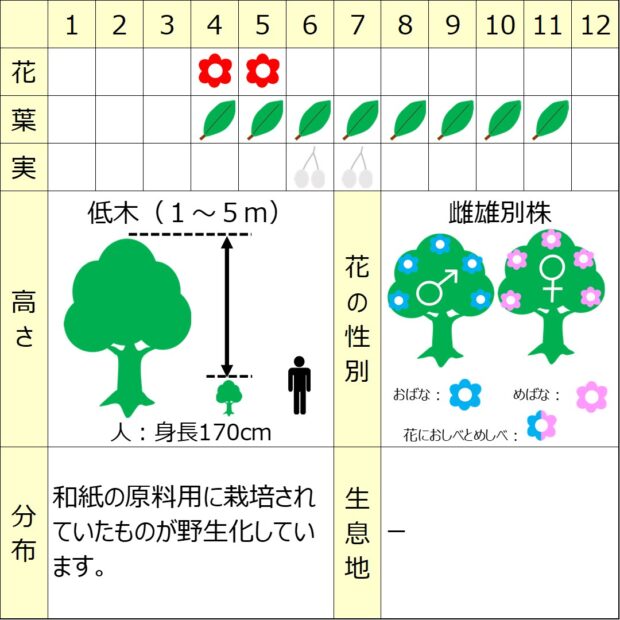 分布中国、 四国、 九州で和紙の原料として栽培。 ときに野生化 |