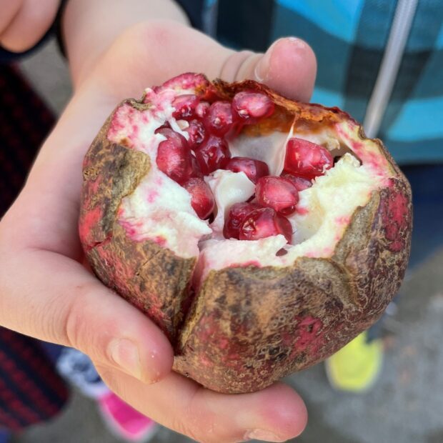 握りこぶしぐらいの大きな実がなります。 熟すと割れて種がたくさん出てきます。