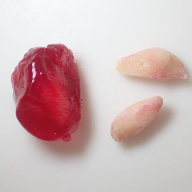 種の周りの赤いゼリー状の部分は食べると爽やかな香りがして甘酸っぱいくて美味しいのですが、 中の種に対して食べられる部分が少ないので好みが分かれます。