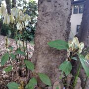 秋には赤い実と花を一緒に見ることができます。 ただしコレは雌の木のハナシ。 実の中には大きな種が1個はいっています。 その種から油がとれ、 昔はそれで蝋燭を作っていました。