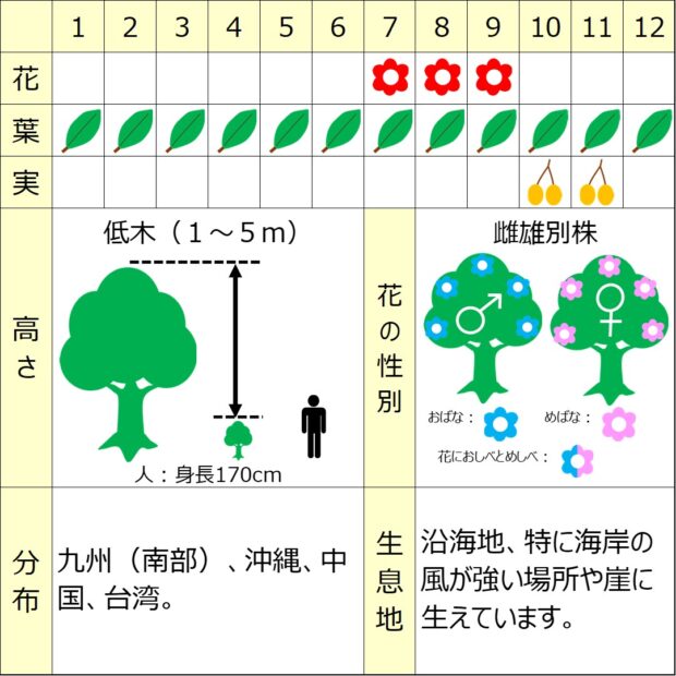 野生では九州南部や沖縄地方に生えていた植物ですが、 独特な木の形が好まれて、 庭や小学校の校庭などによく植えられています。