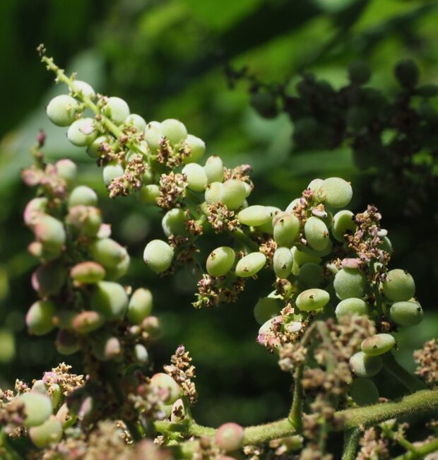 雌雄異株で、 雄花と雌花は別々の木に咲きます。 8~9月頃に、 白い小さな花をまとまって咲かせます。 1つの花は小さいのですが、 集まって咲くのでよく目立ちます。