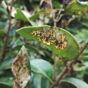 4-8cmで厚みがあって先がとがります。 皮質でツルツルと光沢があります。 トウネズミモチとよく似ていますが、 ネズミモチの葉は日に透かしても葉脈が見えません。