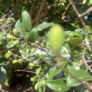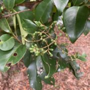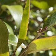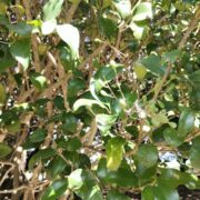 4-8cmで厚みがあって先がとがります。 皮質でツルツルと光沢があります。 トウネズミモチとよく似ていますが、 ネズミモチの葉は日に透かしても葉脈が見えません。