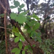 7~9枚の小さな葉っぱが鳥の羽のように付きます。 葉裏と軸に毛があり、 柄の付け根にある托葉(たくよう)という葉が細かくさけている点が、 他のバラの種類との見分けるポイントになります。