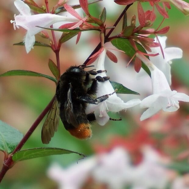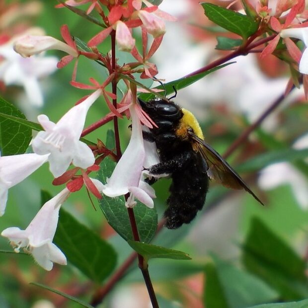 花は街中に住む虫たちのレストラン。 チョウ、 甲虫、 ハチなどいろいろな虫たちがやって来ます。 クマバチは花に穴をあけて蜜だけを盗みます。