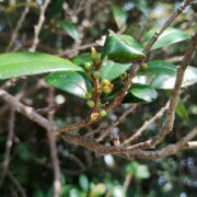花が咲く晩秋、 匂いを頼りにハマヒサカキを探してみましょう。 花の中もよく見て、 雄の木か雌の木か確かめてみましょう。