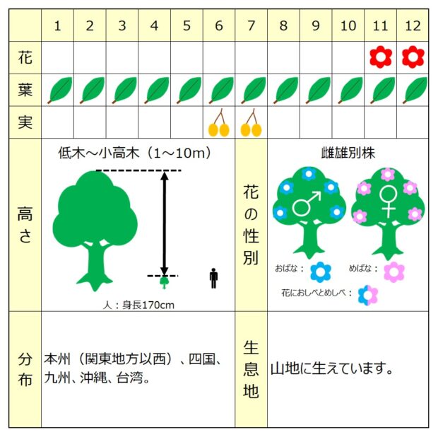 雌の木と雄の木があり、 雌の木にだけ実がなります。 雌の木は数がかなり少ないので見つけるのが難しいです。