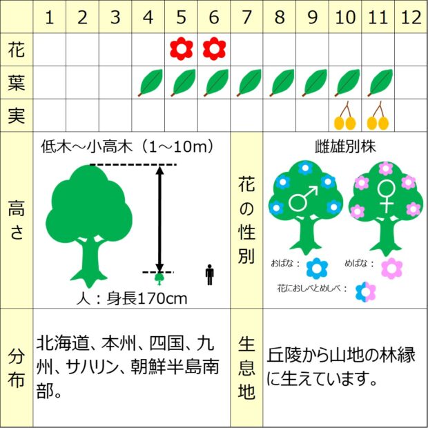 よくしなる枝は、 昔から弓づくり使われました。 木工品の材料としても使われ、 現在でもコケシの材料として欠かせません。 秋にたわわになる実や紅葉が赤くてきれいです。