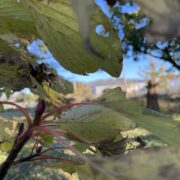 赤い枝についた丸みのある濃い赤色の冬芽がよく目立ちます。