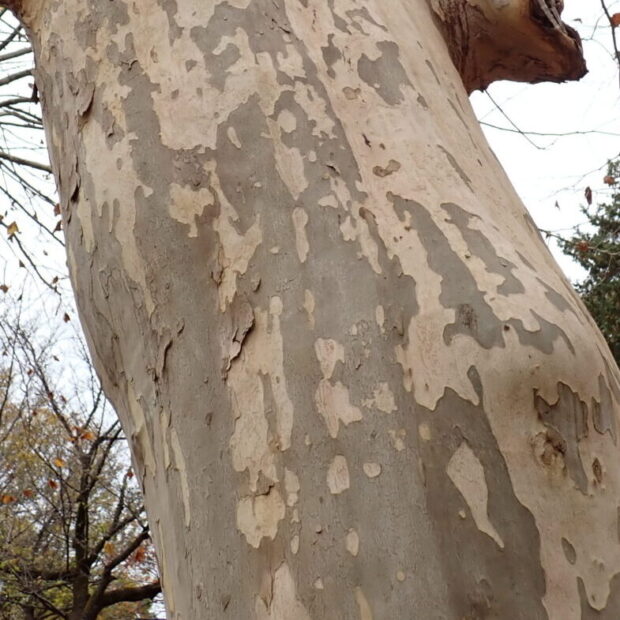 樹皮は若木はまだらにはげ、 迷彩柄のようです。
