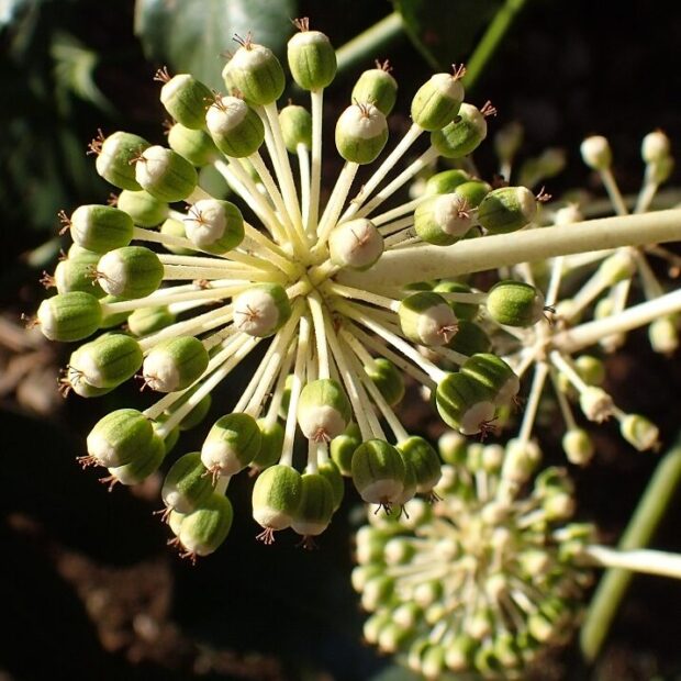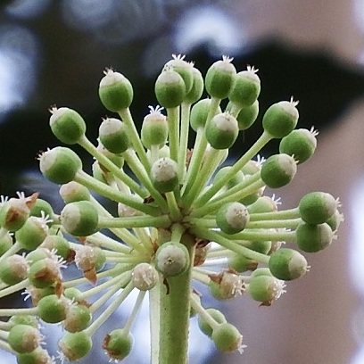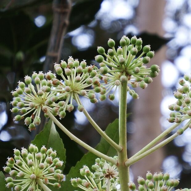 • 花の時期のヤツデ。 派手ではないが姿が美しいということで庭のアクセントとして植えられる。