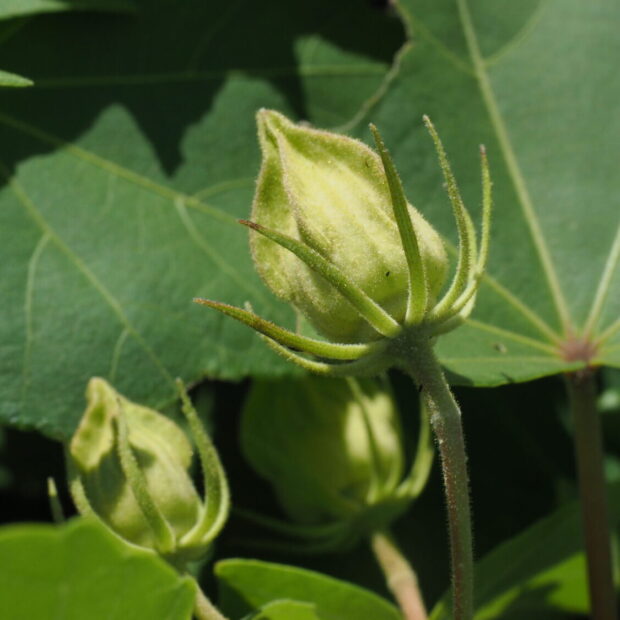 柄が長く、 切れ込みのある大きな葉です。 葉には毛があり、 触るとざらつきます。 花が似ているムクゲとは、 葉っぱを比べれば見分けることができます。