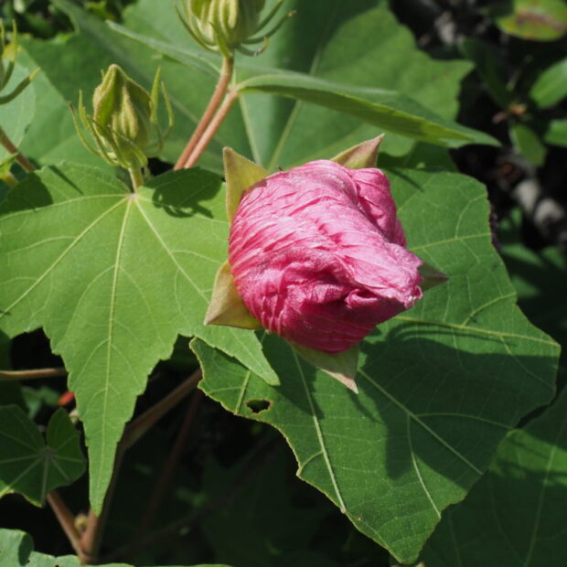 1日で終わる花のはかなさ、 花の色の変化は人の妄想を駆り立てます。 品種のスイフヨウ(酔芙蓉)の花は朝白い花で、 夕方にはピンクになり、 酔っぱらって赤くなるのに例えられ、 酒飲みが勝手に親近感をよせてしまいます。 実際は南国の人。 日なたで大きくなる元気ものキャラな感じです。