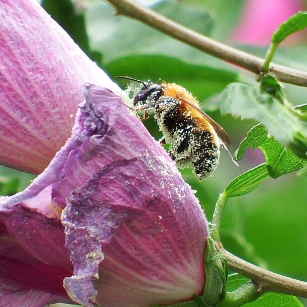 花には花粉がたっぷりあるため、 ハチやコガネムシの仲間などがやって来て、 花粉まみれになっている姿をよく見かけます。
