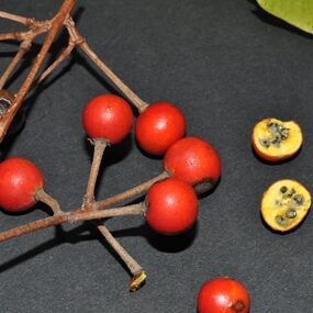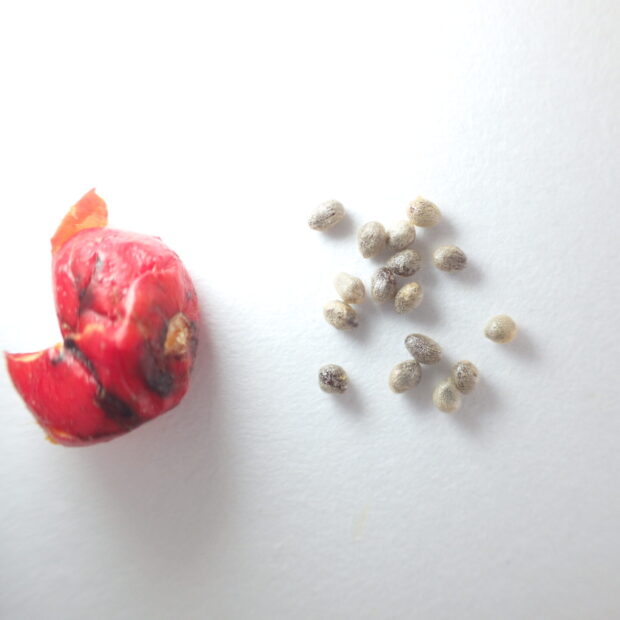 雌花が咲く木に小粒でオレンジっぽい赤色の実がブドウのようにぶら下がります。 中にはた~くさん小さな種がつまっています。 秋から冬にとても目立ちます。