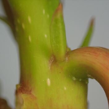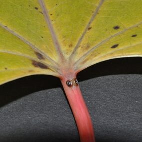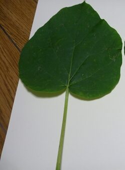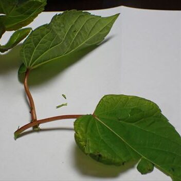 トランプのスペードのような形の葉っぱです。 大きめの葉でギザギザがあり、 葉の柄は長く、 赤みがあることが多いです。 柄の蜜腺(みつせん)にはアリがやってきます。