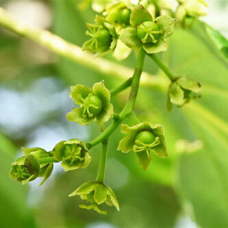 雄花と雌花が別々の木に付きます。 雄花は黄色いおしべが目立ち、 線香花火のようにぶら下がります。 雌花の雌しべは、 退化した雄しべに囲まれています。
