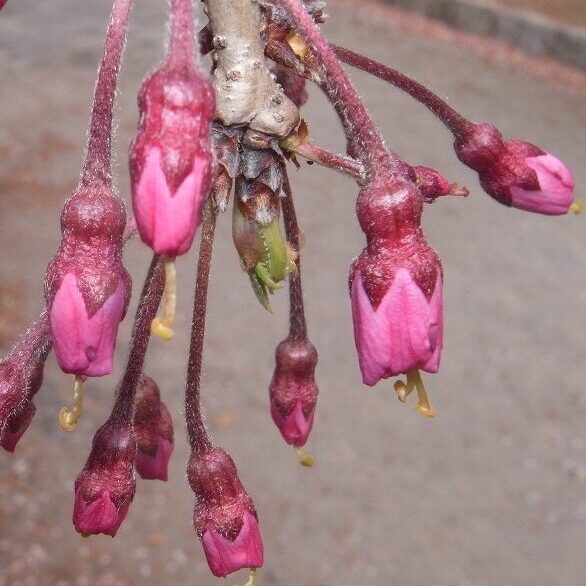 • ヤエベニシダレの蕾。 咲く前に雌しべが花びらの外に突き出ているのが特徴。