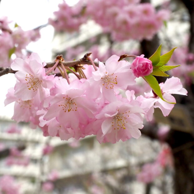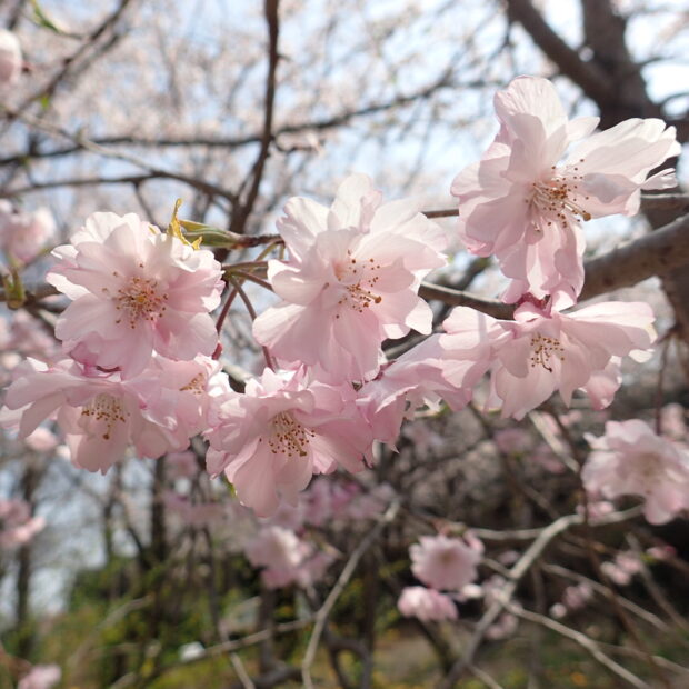公園や庭には八重咲きの品種ヤエベニシダレがよく植えられます。
