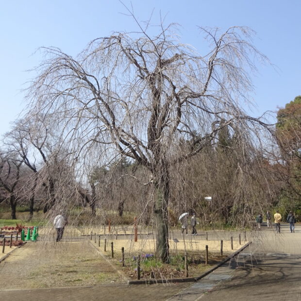 枝垂れ性は劣勢遺伝のため、 枝垂れ性の種子を蒔くと多くが枝がしだれない木になります。 植えられている木は接木でふやしたものです。