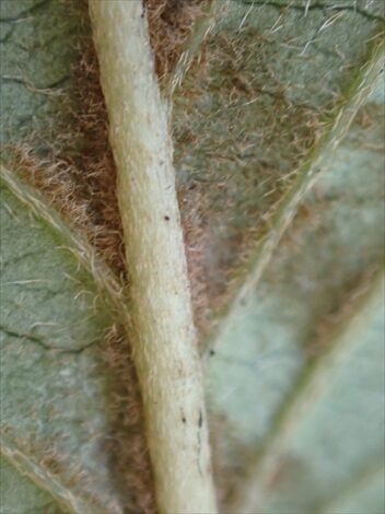 葉裏の葉脈の付け根に茶色い毛が生えています。