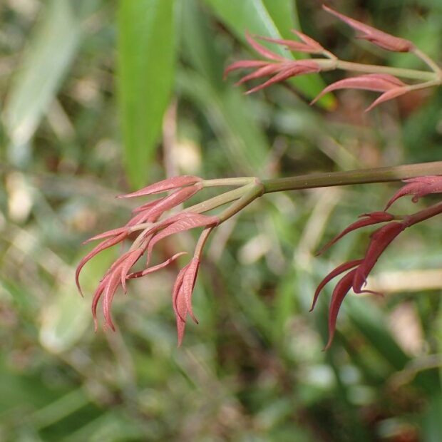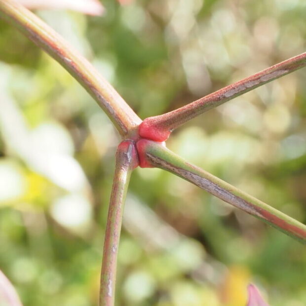赤い冬芽。 幹の一番上の葉の間につきます。
