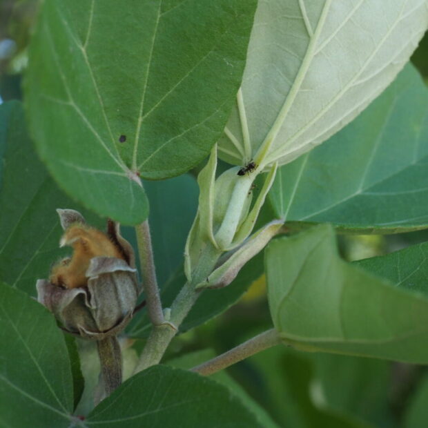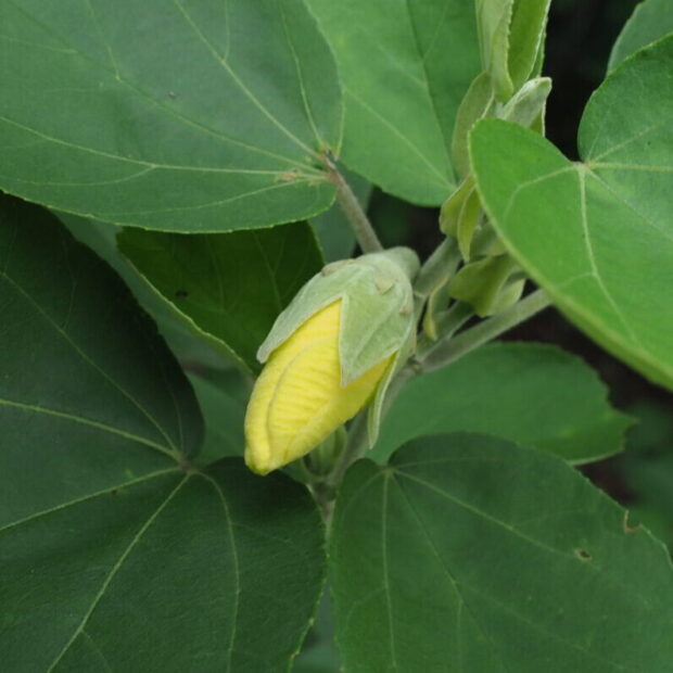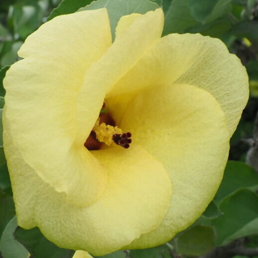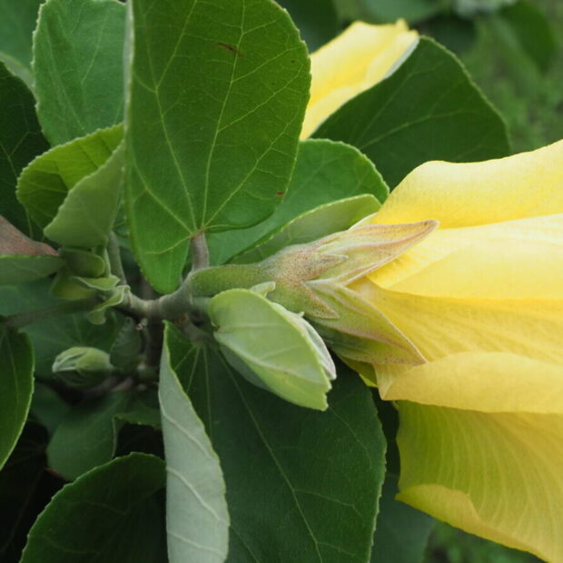 日本原産のハイビスカスと言える花です。 晴れた初夏の青空にレモンイエローの花が生えます。 秋に実る冬の毛むくじゃらの実もぜひ見つけて触ってみてください。
