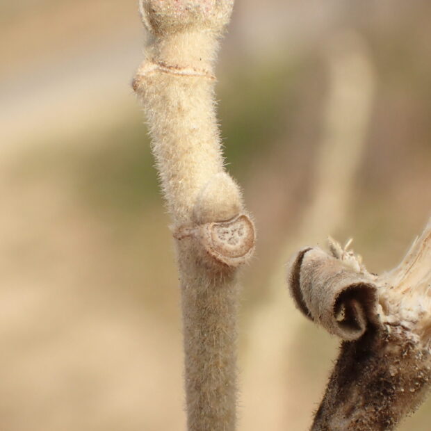 幹は灰色で皮目が多くあります。 枝には托葉(たくよう)という丸い葉の付け根に生える葉の落葉で残った線があります。