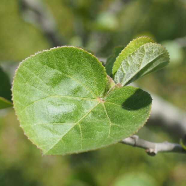 波状の小さいギザギザがある丸い葉。 先がちょこんと突き出ています。 互生で葉脈は手を開いた様に葉の付け根から5本のびています。 表と裏に白っぽい毛がありますが、 裏は特に毛深い。