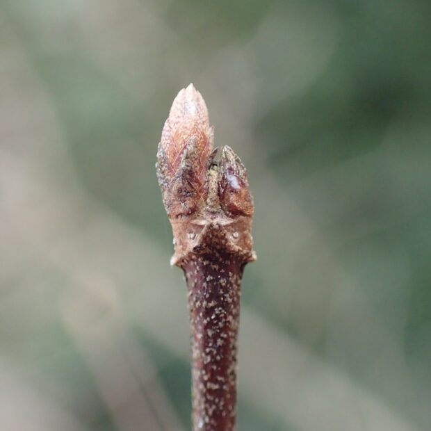 枝の途中にも冬芽はつきますが、 枝の先端には2つの芽が付くのが特徴です。