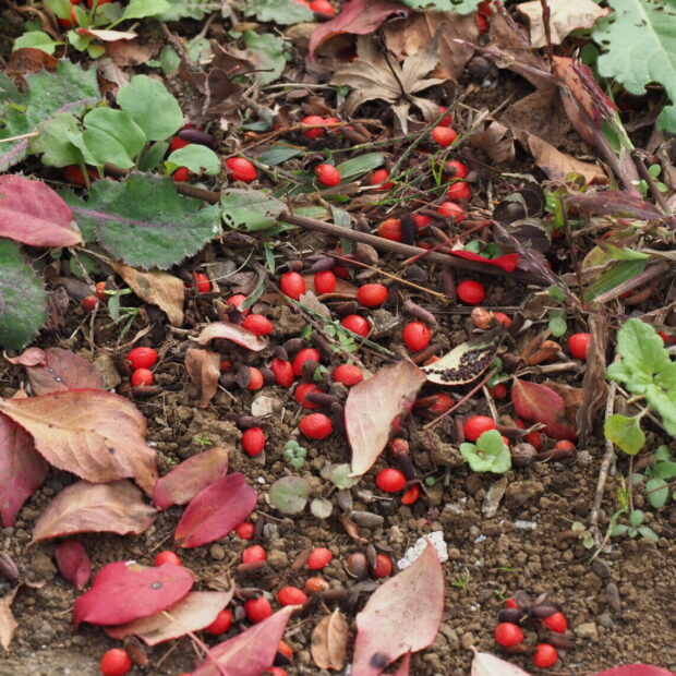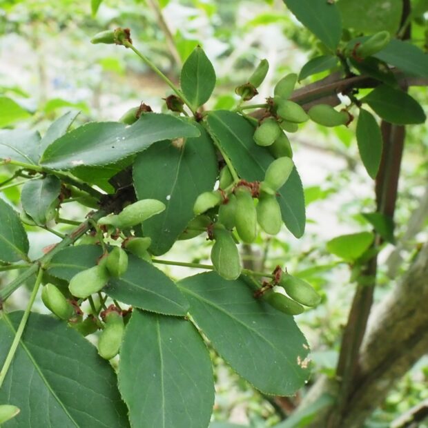 1つの花は1~2個の実になります。 実の大きさは5~8㎜ほどで楕円形です。 実は10~11月に裂けて開きます。 中には橙赤色の皮に包まれた種が見られます。