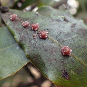 枝や葉にルビーロウムシというカイガラムシがつくことがあります。 カイガラムシがびっしりつくと、 排泄物にカビがつき、 すす病を引き起こし葉が黒くなります。