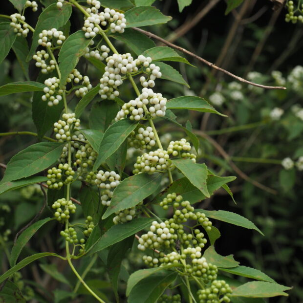 • シロシキブという白い実の品種もあります。 ムラサキシキブと一緒に植えて実の色の違いを楽しんでみては⁉