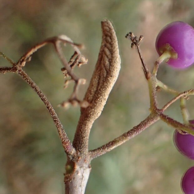 3~4mmの紫色の丸い実。 秋から冬にかけて陽の光にキラキラ光ってよく目立ち、 秋の森の中を素敵に演出してくれます。 実の中には2㎜くらいの種があります。