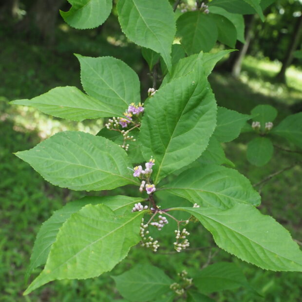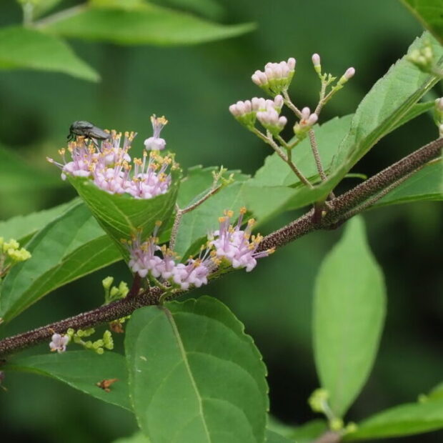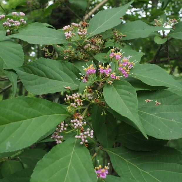 葉に食べあとがあれば、 イチモンジカメノコハムシや、 蛾の幼虫(ヨスジノメイガ、 マタスジノメイガ、 マエベニノメイガ、 ムラサキシキブツツヒメハマキなど)がいるかもしれません。