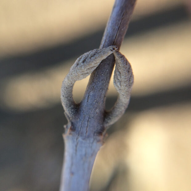 芽をおおう皮はなく、 粉のような毛のある葉がピチッととじている状態の芽です。 葉痕の維管束痕は1つで、 少し出っ張っています。 にっこりしたお口に見えます。