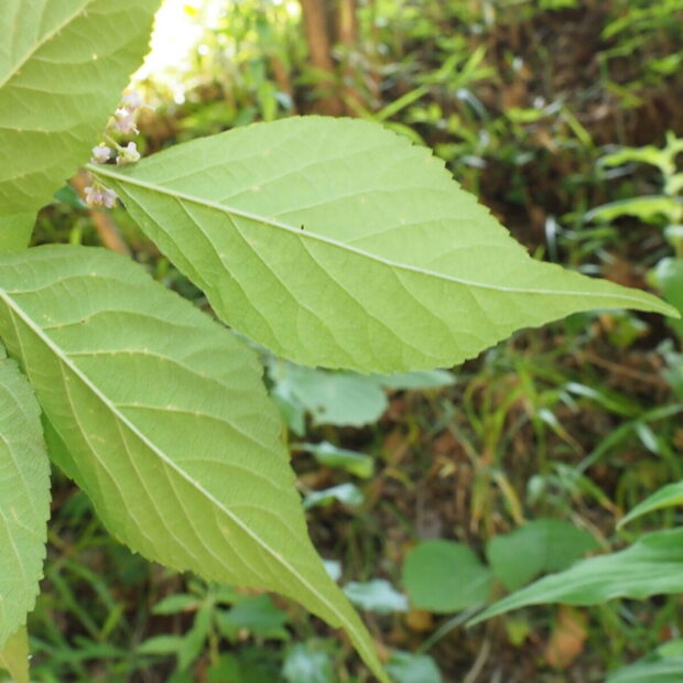 先と付け根が細くなり、 ひし形っぽい葉っぱです。 対生に付き、 ふちには細かいギザギザがあります。 大きくなった葉っぱには毛が無ありません。