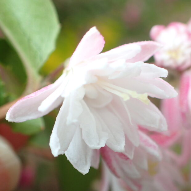 初夏から夏にかけて咲く花は八重咲きで外側の花びらがピンクに色づきます。