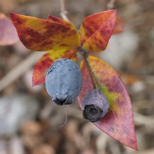 秋にブルーベリーのような青味がかった黒い実がなります。 食べられますが、 苦味が強いです。