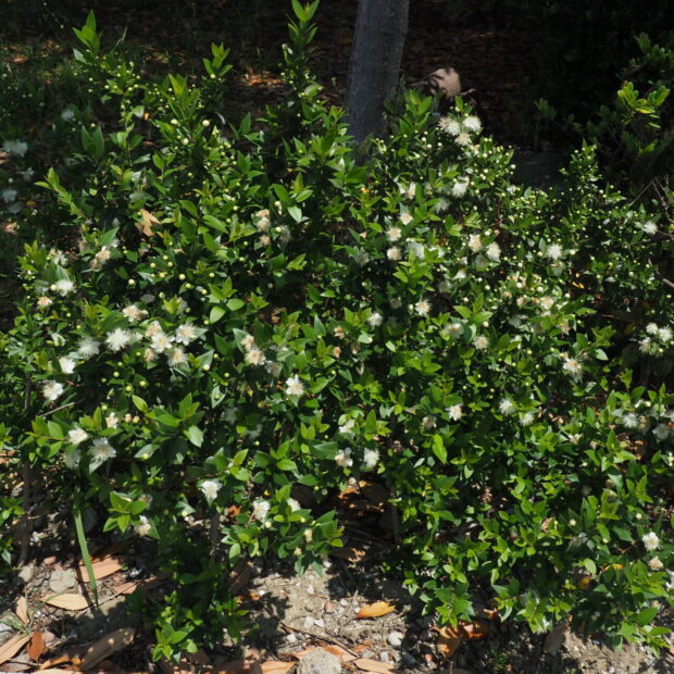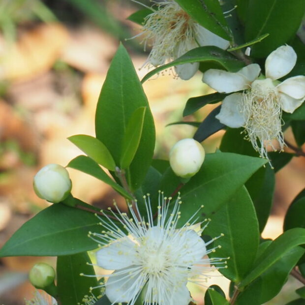 漢字で「銀梅花」と書き、 ウメに似た花を咲かせます。 マートルとも呼ばれます。