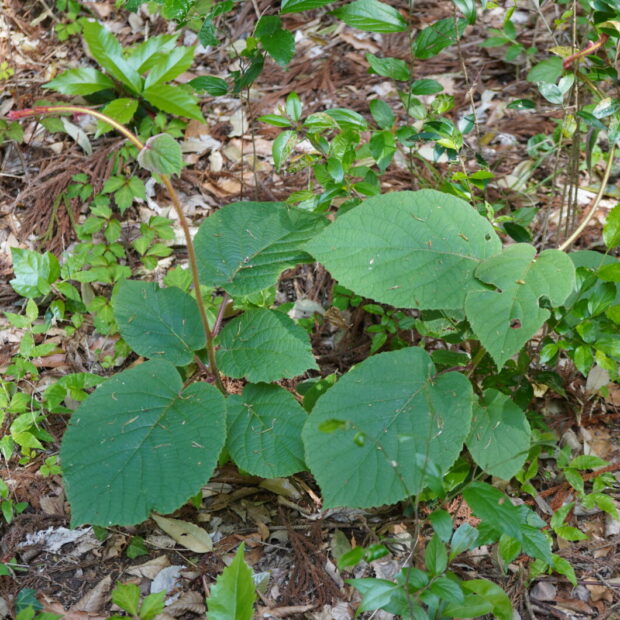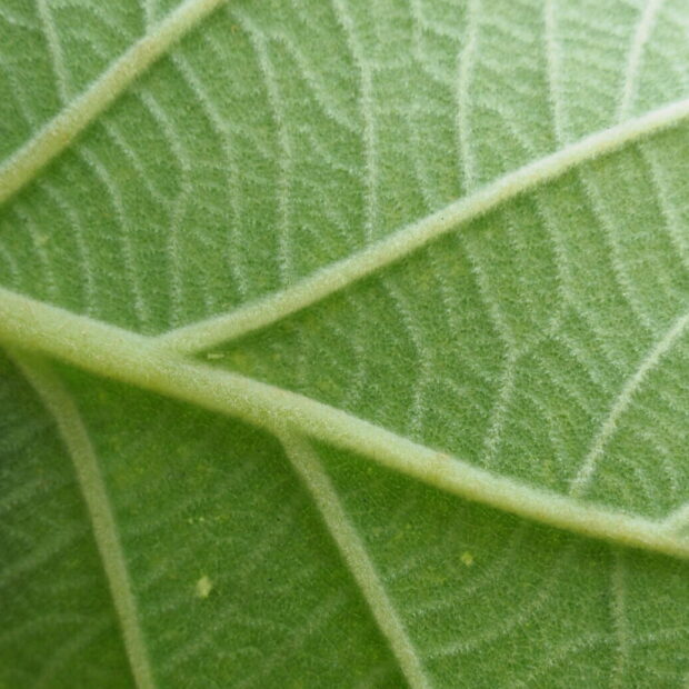 葉は交互に並びます。 厚みのある丈夫な葉っぱで、 葉の裏に毛がたくさんあります。 葉の柄は3~10㎝と幅があり、 場所によって長さに違いがあります。
